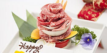ランチ 肉ケーキでもてなす記念日プラン~星遊山アニバーサリーコース~ (税込み4,500円) 6品 肉をケーキのように盛りつけた星遊山名物の“肉ケーキ”をはじめ、5種類もの極上の焼肉をいただいた後、デザートは目の前で作られる魅惑の-196℃シャーベット.